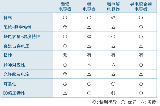 1. 額定電壓100V以下 高介電常數(shù)型???去耦、平滑電路用 溫度補(bǔ)償型???調(diào)諧電路、振蕩電路、高頻濾波電路用 2. 額定電壓200V以上 高介電常數(shù)型???鉗位緩沖電路、平滑電路用 溫度補(bǔ)償型???電源緩沖阻尼器 |